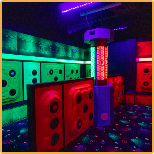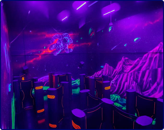 Our laser game arena welcomes up to fifteen fearless players. Get ready to be amazed by glow-in-the-dark murals, reactive BlackLight, interactive structures, and captivating targets, all accompanied by striking sound effects that will immerse you in the heart of the action.