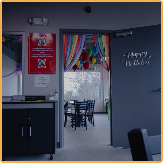 Our party room can accommodate multiple party groups at once, with a table set up to accommodate the number of guests you desire.